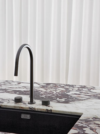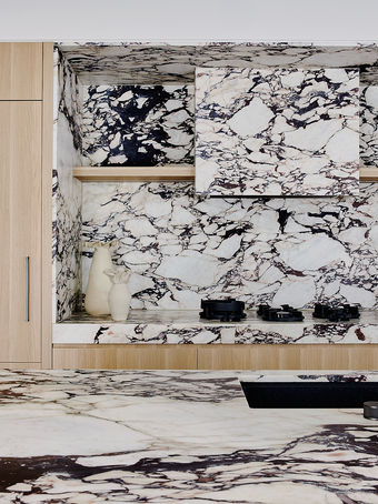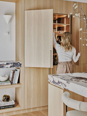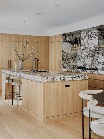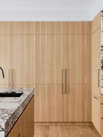 An early 2000s home needed intervention to elevate its aesthetic and rejuvenate its interior spaces to suit the client's lifestyle. A pared-back palette was employed throughout, allowing the materials to take centre stage. Dramatically veined marble, light oak millwork and gunmetal hardware and fixtures combine to create a sophisticated family home, perfect for entertaining.